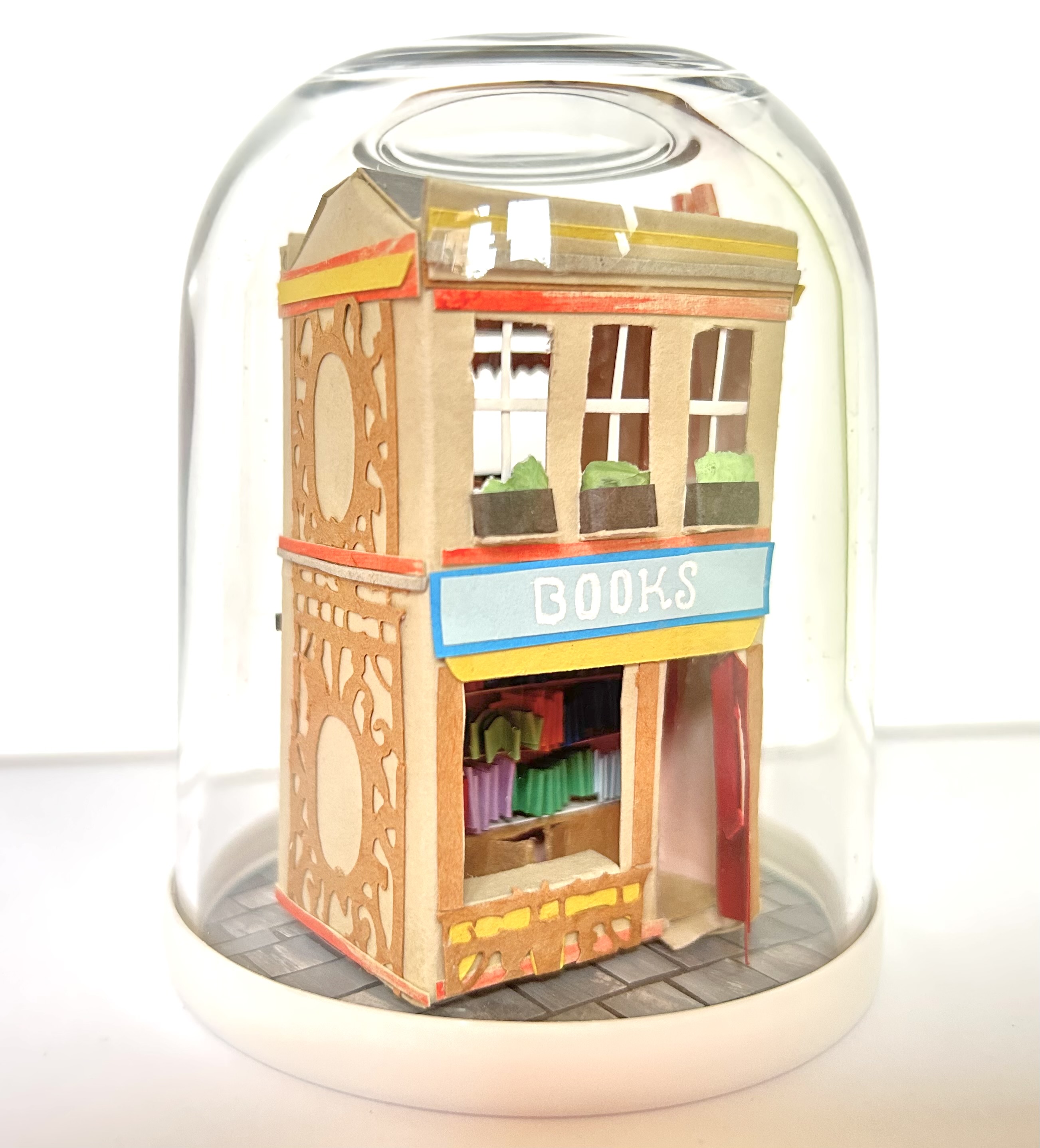 I wanted to test myself and see how small-scale I can work. I made this miniature book shop. It is small enough to fit into a spread pot. I made miniature paper furniture for the rooms inside the windows. I used it for a prompt for the September challenge I took part in. I hope to make more beautiful miniature buildings in future. I will give it another go and see what I can turn out with a less strict deadline next time.