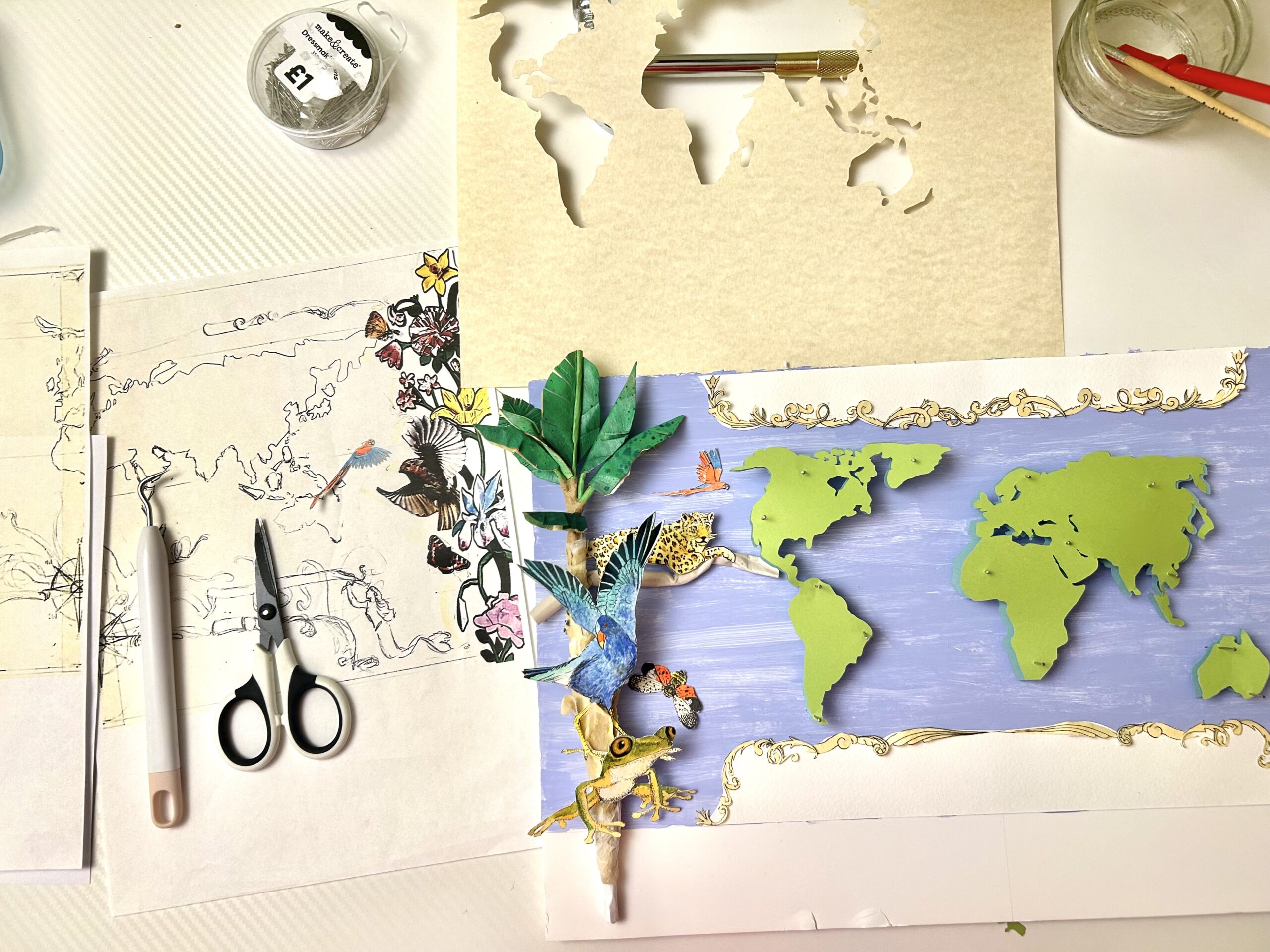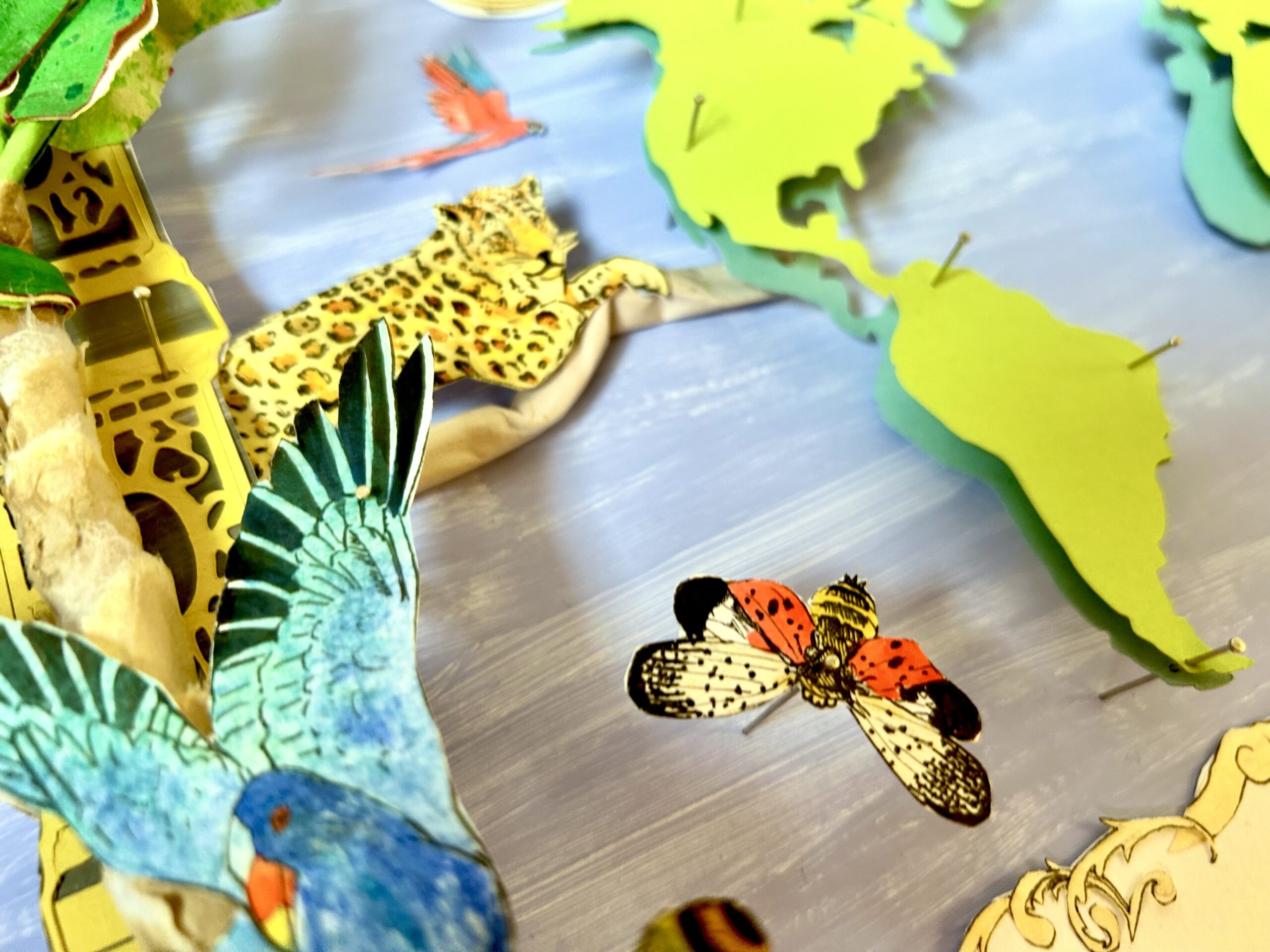 I have been using pinboards to build a map illustration on the journey of 18th century Artist Scientist and Adventurer Maria Sibylla Merian. Voicing the role women played to influence science and their life stories is so important because it is these stories that have too often been forgotten. Maria’s colourful life story is an interesting tale. I am working on a picture book to share her story with young readers.